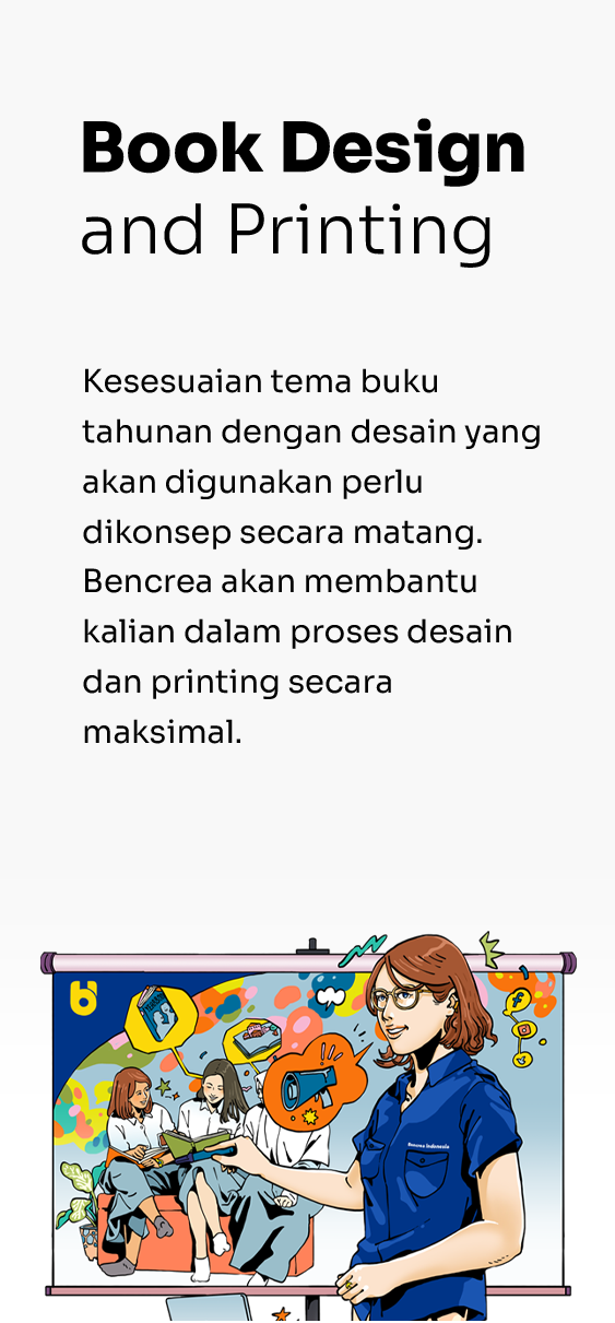 Waktu produksi buku tahunan bisa bervariasi tergantung pada kompleksitas desain, jumlah halaman, dan kecepatan dalam penyerahan data ke Bencrea Indonesia. Biasanya, proses produksi memakan waktu 3-4 Bulan.